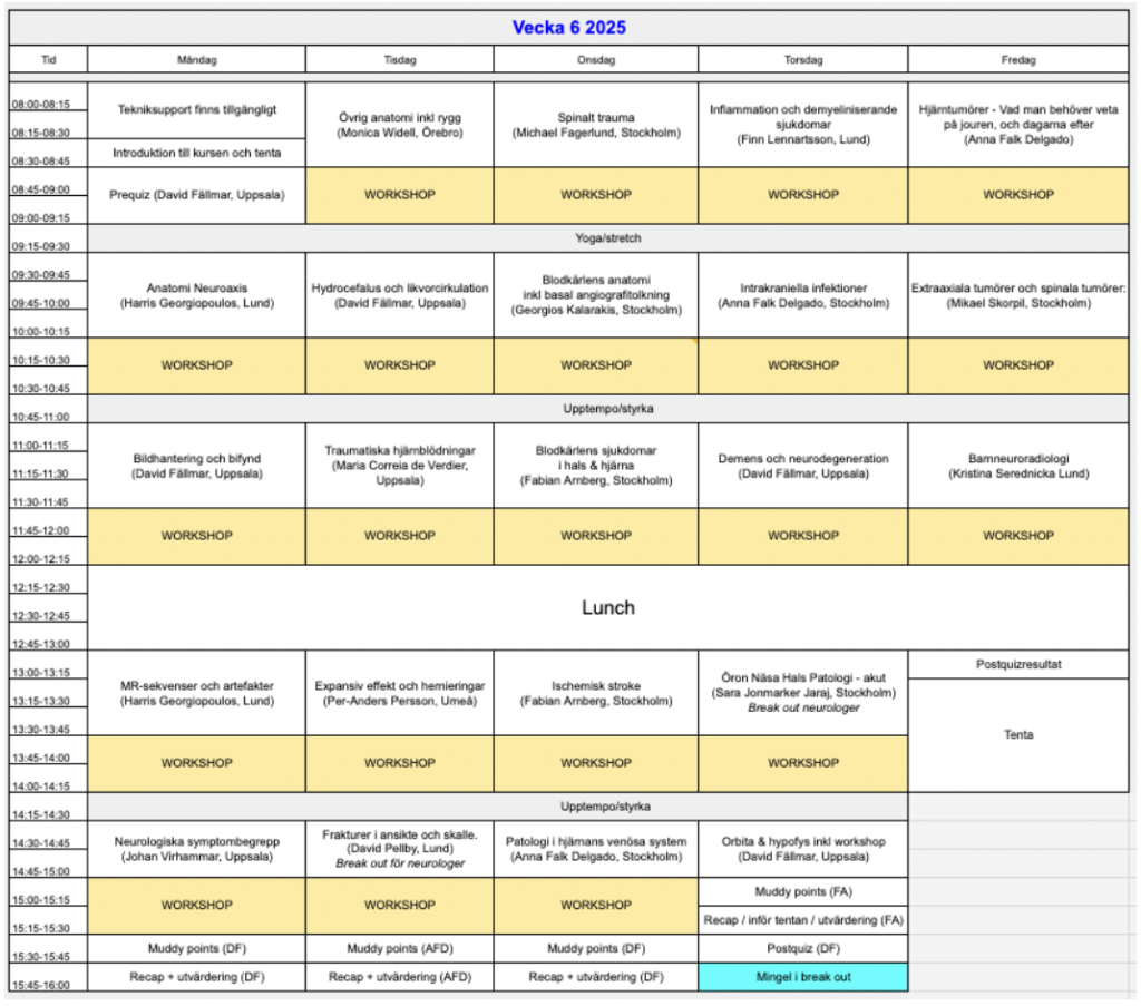 Vi har bjudit in föreläsare från alla Sveriges universitetssjukhus för att ge er en heltäckande bild av ämnet. Vi har varit särskilt noga med att bjuda in unga och talangfulla specialister, eftersom vi vet att de kan presentera grundläggande kunskap på bästa sätt. Under åren har flera förbättringar av schemat genomförts baserat på önskemål i kursutvärderingarna. Bland annat ges mer utrymme åt workshops samt grundläggande tolkning av fynd och bifynd.